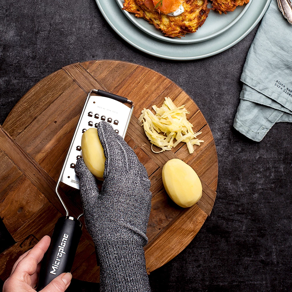 Der silbergraue Microplane Specialty Schutzhandschuh ist die Ritterrüstung für das sorglose Schneiden, Reiben und Hobeln von Lebensmitteln mit allen Microplane Reiben. Die Dehnbarkeit des Handschuhs reicht für kleine bis große Rechts- und Linkshänder.