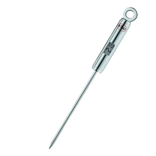 Das Rösle Gourmet-Thermometer aus Edelstahl hat eine digitale und beleuchtete Temperaturanzeige zum schnellen und zuverlässigen Messen von Kindernahrung, Tee und Wein, für Braten und Fritteuse mit einem Messbereich von -40 bis +200 Grad Celsius, umschaltbar auf Fahrenheit. Mit Hängeöse passt es an die Küchenleiste und ist so immer schnell einsatzbereit und braucht nur 5 bis 10 Sekunden, eine Temperatur zu messen.