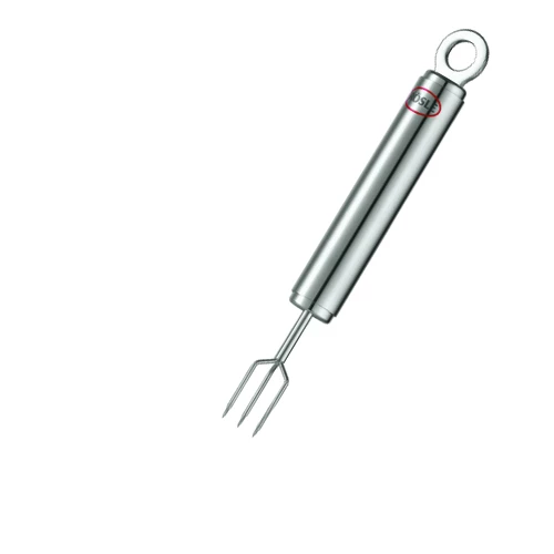 Die Rösle Pellkartoffelgabel 17cm ist unverzichtbar und hält heiße Pellkartoffeln mit drei dünnen Zacken sicher fest. Dieser klassische Küchenhelfer hat einen Rundgriff aus Edelstahl und eine Öse zum griffbereiten Aufhängen an der Küchenleiste.