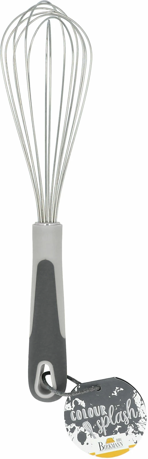 Aus der farbenfrohen Küchenserie Colour Splash von RBV Birkmann ist der inklusive Griff 36cm lange Schneebesen grau 27cm ein Akrobat in allen Schalen und Schüsseln: bester Küchenhelfer mit Edelstahlkopf und praktischer Hängeöse für die offene Küche.