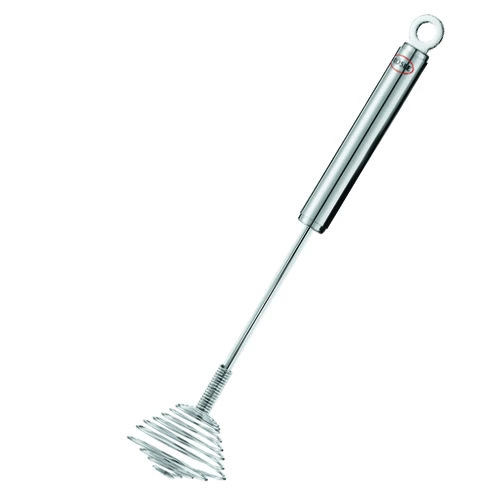 Der flexible Rösle Quirlbesen 27cm aus Edelstahl ist spiralförmig und ermöglicht luftiges Verquirlen, ideal für kleinere Mengen wie Pudding in schmalen Gefäßen. Der runde Griff ist edel, sehr angenehm in der Hand und hat eine Öse zum griffbereiten Aufhängen an der Küchenleiste.