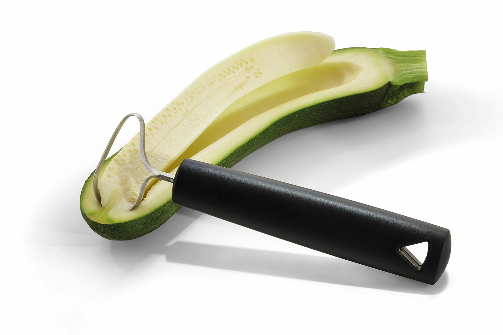 Mit dem Entkerner von Triangle Solingen, geliefert im schützenden Karton, können Sie schnell lästige Kerngehäuse aus Obst und Gemüse entfernen. Die Schlaufe mit einer spitzen und einer breiten Seite ist rundherum geschärft, sodass verschiedene Formen keine Schwierigkeit darstellen. Dabei hinterlässt die Schlaufe eine glatte Oberfläche, die auch bei besonderen Mahlzeiten optisch beeindruckt.