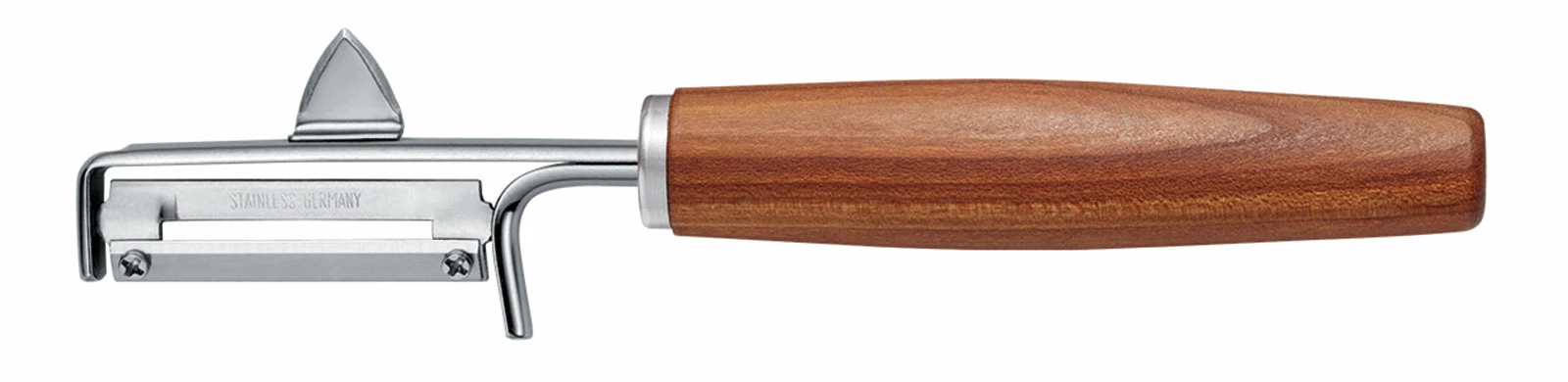 Der Pendelschäler rechts mit dem Griff aus Pflaumenholz von Triangle Solingen ist ein Qualitätsprodukt, das Ihnen lange erhalten bleiben wird. Die hochwertige Edelstahlklinge schält sparsam und kann bei Bedarf ausgetauscht werden. Der Schäler ist außerdem mit einem Dorn ausgestattet, den Sie verwenden können, um unschöne Stellen aus Gemüse und Obst zu entfernen.